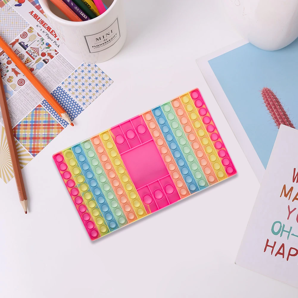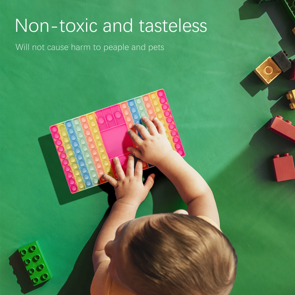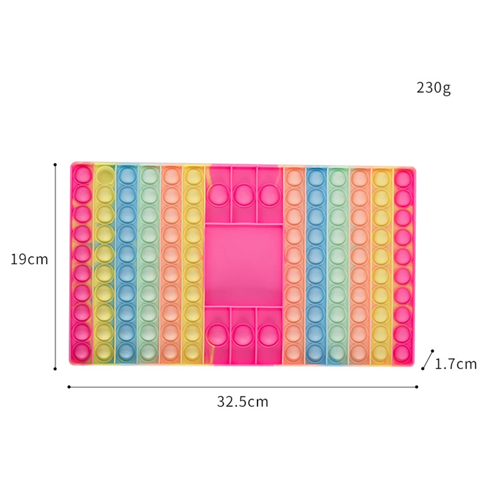 Silicone Chessboard Push Bubble Pendant w/ Keychain Sensory Squeezing Toy Anti-stress Relaxing Fidget Toys Stress Relieve Autism Needs Feature: 1. The rules of the game is simple and easy to understand, children, the elderly can play, or a very good family parent-child interactive toy game. 2. Small size, can be squeezed and pulled without deformation, convenient storage, easy to carry. 3. Brain logic and reasoning, oral and mental arithmetic, odd and even numbers, integrated planning and other abilities to prevent brain degeneration. 4. When you press the bubble button, the bubble will make a slight thumping sound, then flip it over and start again. 5. Made of environmentally friendly materials and can be endlessly reused and washed. 6. Bright colors and shapes, press the bubble button there is a pleasant sound (note that due to the production process there is a side to press the sound will be smaller), but also will certainly make your children feel satisfied. 7. Multifunctional use, both as a toy can also be used as a tea coaster, the ideal gift for your friends. 8. This push bubble toy is a great sensory toy, you can repeatedly press down again and again, top up. By repeating a single action to help children and adults in high stress or anxiety states to relieve and vent stress, these toys are perfect for offices, homes, churches, libraries, stations, special education classrooms, physical therapy and sensory rooms, and travel. 9. You can enjoy the fun anytime and anywhere: no accessories not easy to lose, compact size, durable, you can enjoy fiddling by yourself or invite friends to a quick brain game, no matter where you are, you can enjoy the fun of the game. 10. To clean, simply rinse in the sink and air dry. Specification: Name: Push Bubble Toy Material: Silicone Color: Rainbow Size: 32*19.5cm Quantity: 1pc Fidget Toy Suitable Age: 3Y+ Crowd: Children, The Elderly, The crowd with pressure are suitable. Game Rules: 1. Each player takes turns to press any number of bubbles in any row, (Note: If you press multiple bubbles, they must be connected.) The opponent can also press the bubble that have not been pressed in the row/other rows. 2. The player who pressed the last bubble is the loser. 3. Turn the toy over to start the next round immediately. Note: 1. Due to the manual color adjustment of the rainbow model, it is inevitable that the color distribution of different batches is slightly different. 2. Due to the different monitor and light effect, the actual color of the item might be slightly different from the color showed on the pictures. Thank you! 3. Please allow 1-2cm measuring deviation due to manual measurement. 1 X Fidget Toy |